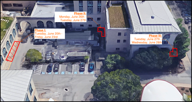 Phase II consists of digging a test pit in the corner of Porter Hall and Addition. Pedestrians will be detoured around the construction fence.
