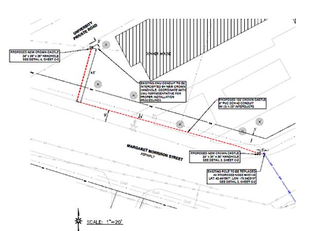 Crown Castle will be performing some underground utility work in the sidewalk at Margaret Morrison Street on the South side of Donner Hall on two dates.